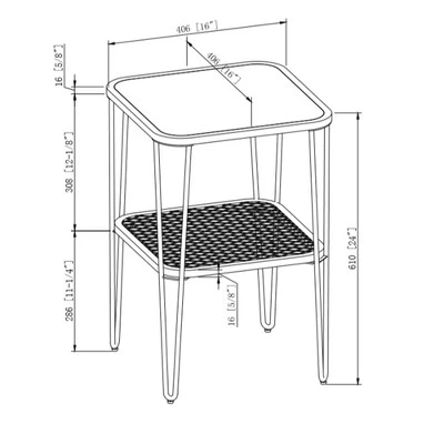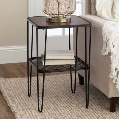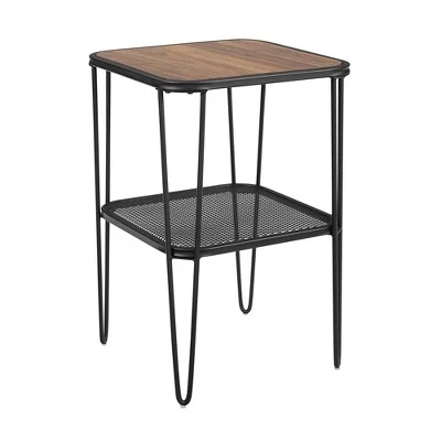 Add an urban industrial element into your home with this mixed material hairpin leg side table from Saracina Home. Wherever and however you want, this accent stand allows you to incorporate a masculine component into a variety of room styles. Use it as a nightstand or end table beside your sofa. The lower metal mesh shelf creates extra storage space that makes a great home for Bluetooth speakers, books, or a convenient stash of your favorite candy. Hairpin legs create a compelling silhouette. Complete the collection with the matching coffee and entryway table options.Overall Width: 16 inchesOverall Height: 24 inchesOverall Depth: 16 inchesHeight from floor to Shelf: 11.25 inchesHeight from shelf to table: 12.16 inchesTabletop Thickness: .63 inchesShelf Thickness: .63 inches