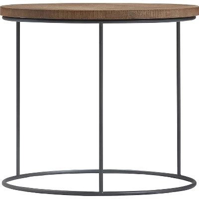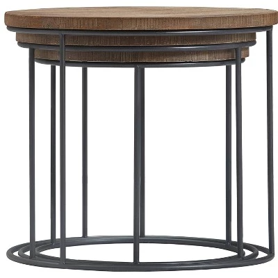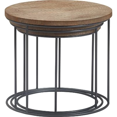 With inspiration coming from a relaxing mountainside getaway, the Berkshire nesting side tables bring warmth and charm to any living room. Strong wood grains on distressed solid wood create laidback charm, and a black metal tube base offers unique appeal with its three legs. Circle on circle, each round end table provides an airy look that gives your entire room an open and inviting feeling. Neatly tuck the small and medium table under the largest when you donβt need as much surface area, or stagger them into a stepped display for that added bit of space. Try these accent tables out in your bedroom too, as an unexpected take on a nightstand. Set includes three tables, from Finch.