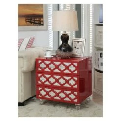 Style your bedroom, living room, or office with a glamorous side drawer. This sleek display offers three drawers on metal glides, each showcasing mirrored fronts embellished with a quatrefoil pattern. The glossy storage stands on turned acrylic feet for a chic appearance. Choose between three color options: elegant black, sophisticated gray, or a dramatic red.