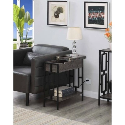 Bring home the functionality of the Town Square Flip Top End Table with Charging Station and Shelf by Breighton Home. Featuring a flip top that reveals a convenient charging station as well as storage space for your remote controls or favorite book. Charging station includes two standard outlets and two USB ports which can easily charge your phone, tablet and even your laptop. The cable management hole allows you to store multiple devices on the table without damaging cords. The power supply cord is 6 feet in length giving you the room you need to display your end table where you choose. Includes a bottom shelf for additional storage or display.