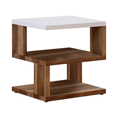 Complement a cool, casual living space with the contemporary flair of this two-piece accent table set. This visually appealing geometric set includes a coffee table and end table. Both pieces in the set feature a variegated wood finish base and lower shelf contrasting beautifully against the glossy white tabletop, bringing both Contemporary and Rustic elements into play.