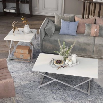 Glam up the sitting room or home office with this two-piece set of high gloss white living room tables. The coffee table and end table make for a dynamic duo with their playful chrome-plated frames. This steel build is sturdy yet gracefully chic. Atop levelers, the tables will always stay balanced and hold the clean-cut lines.