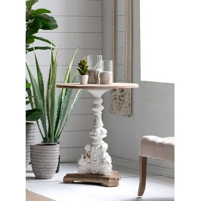 Made with fir wood and displaying a natural wood finish, the Antique White Round Side Table is a unique spin on the traditional round table. The carved pedestal base features a classic, elegant flowers with exciting detail. Perfect for placement in a living room, bedroom, or even a dining area, this piece exudes a classic vintage style that will complement many decor styles! This item belongs to a collection of items created and designed by A & B Home, Inc., a family owned business founded in 1993. A & B Home Inc. is recognized as an international leader specializing in quality products with innovative design for the home decor, furniture, garden, and seasonal product categories.