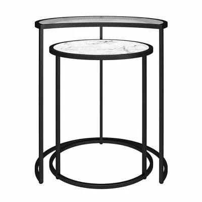 - Featuring 2 delicate black framed end tables with elegant fluted glass top above, revealing a contemporary soft faux marble top below
