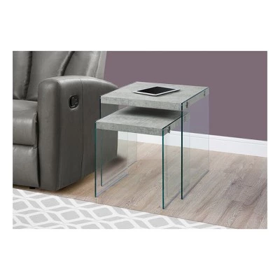 Featuring a chic gray cement-look surface, this 2pc nesting table set adds exceptional style to any room. The unique tempered glass base provides sturdy support as well as a contemporary look. Use this multi-functional set as end tables, lamp stands, decorative display units, or simply as accent pieces in your living room, family room, den, or office space.