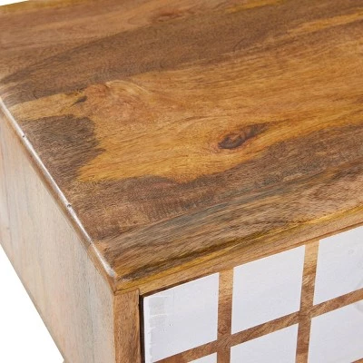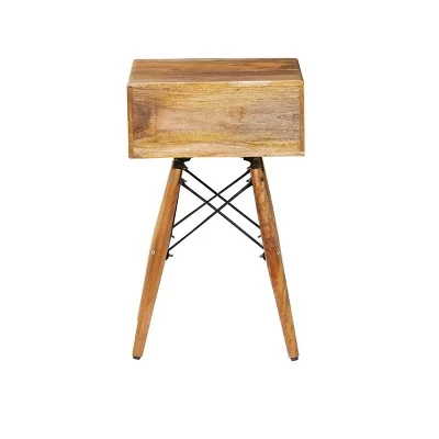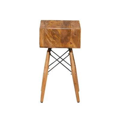 Ultra-modern with a fun design accent, this wood side table features rich golden brown natural mango wood with exposed wood grain throughout the square drawer top and mid-century legs. The face of the drawer has several white painted squares for a very modern style element, nodding to mid-century geometric patterns. The drawer pulls open by the finger notch cutout in the center and smoothly glides open and closed on the wood side guides. The legs have extra support from the black iron posts and stays in place by the hard rubber stoppers under each foot. This is a great bedside table or sofa side table!