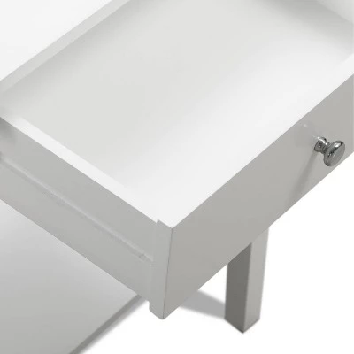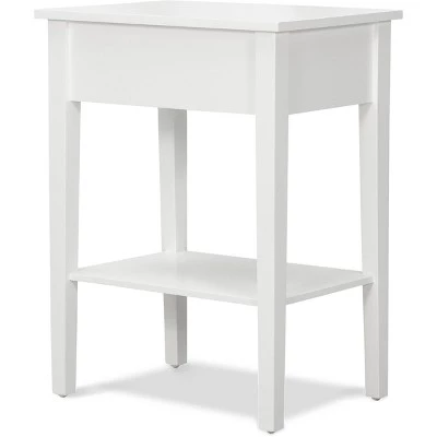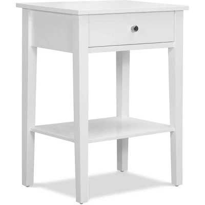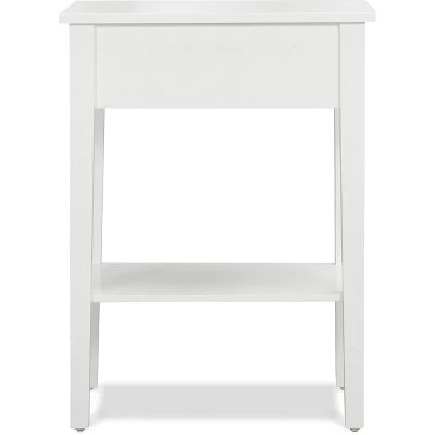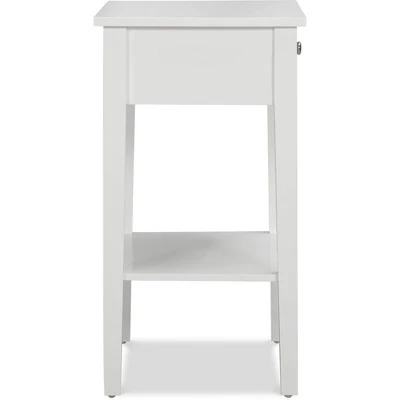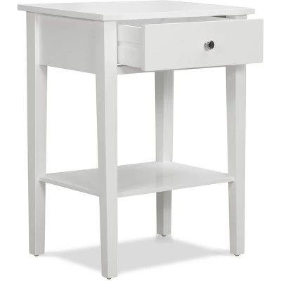 Perfect for displaying family photos or keeping your magazines organized, this end table is a stylish addition to any living room. In a graceful classic design that transcends home dΓ©cor trends. Available in a charming white finish that complements most decor schemes. The timeless tapered wood legs of this design will never go out of style. The square table top, lower shelf, and storage drawer provide ample space for your favorite decor.