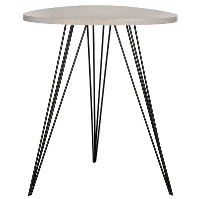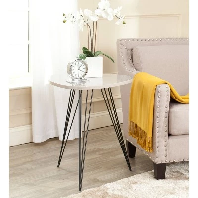 Contrasting colors and textures pack a punch in the chic and contemporary Wolcott side table. A round wood grained MDF top and triad of black iron hairpin legs make an open, airy statement in beside a living room sofa or bedroom armchair. Constructed from MDF wood and black colored iron, this side table is able to support up to fifty pounds. The simple contemporary design allows it to be an easy to style piece in your room. The Wolcott table is the perfect choice for Contemporary, Mid-Century, or Modern style rooms.