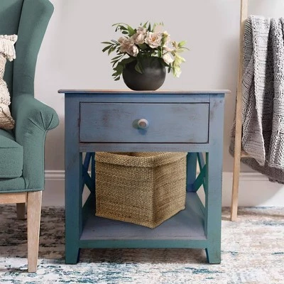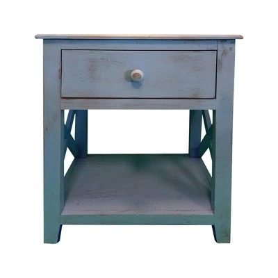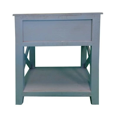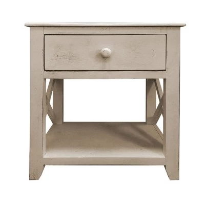 Quality craftsmanship meets transitional style with this Side Table, which comes with X cut out side panels. Incorporated with a smooth gliding drawer to keep your essentials handy and organized, it offers an open bottom shelf to keep magazines and books. Constructed sturdily from Brazilian pine wood frame for prolonged durability, this end table supported sturdily on chamfered legs. Accented in a striking white tone finish, the rough saw hewn texture impart this piece of furniture with a rustic appeal. The drawer is incorporated with a round pull handle to facilitate the storage space easily. The tabletop can be used as an abode for exotic decor, vases, showpieces and as a convenient storage space within your arms reach while lounging on sofa.