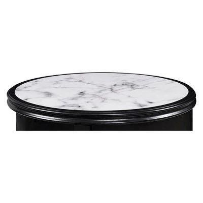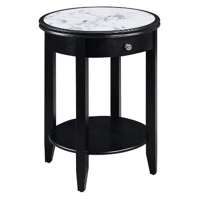 Add elevated style to your space with this American Heritage Baldwin End Table with Drawer from Johar Furniture. Crafted with a wood-finished frame and marble-like accents on the table top, this end table makes an eye-catching focal point of your living space. Dress it up with a lovely display piece or lush green plant for a pop of greenery while the drawer beneath allows neat stowing away of media accessories. The lower shelf allows added storage or display space for any collectibles.