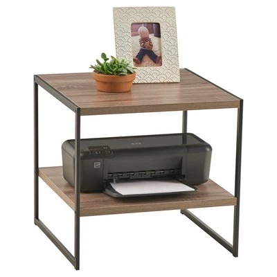 Closet Maid’s Mixed Material End Table features two open-space shelves, perfect for standing a sofa-side lamp, storing and displaying your favorite books and more, or as a sturdy and spacious printer table for your office. Available in two laminate wood finishes on a black steel frame, this unit offers understated industrial styling with a sturdy 75lb weight capacity for your living room or office. Complete the look with other pieces from the Mixed Material collection, including desk, ladder bookshelf, and entertainment table.