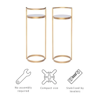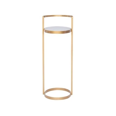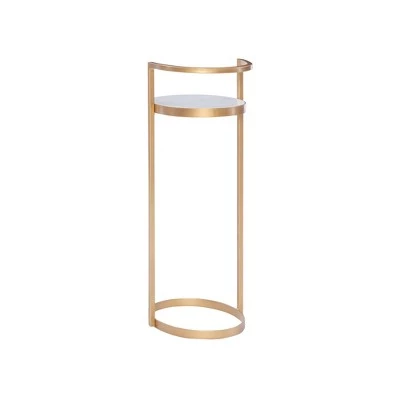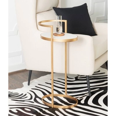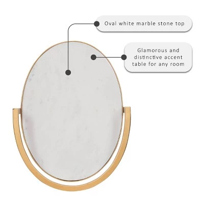 Elegant and distinctive, this drink table can do more than hold beverages. This chic table looks lovely sitting solo or set alongside a sofa. The open metal base allows surrounding accents to breathe, while the gold finish completes the look. A clean white marble oval top provides a perfect stage for drinks, candy dishes, framed photos and beyond. Levelers under the oval iron base ensure a stable surface to keep your belongings safe. The compact size allows the table to be effortlessly placed where itβs needed most.
