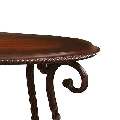 Add a touch of elegant flair to your indoor space with the Crowley End Table from Steve Silver. This circular accent table features a cherry-wood tabletop resting atop swirling metal legs for a touch of texture and style. Complete with ribbon detailing along the edge, you can use this decorative end table for displaying decorative accents next to an armchair or in any living space in your indoor decor.