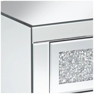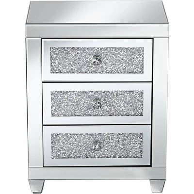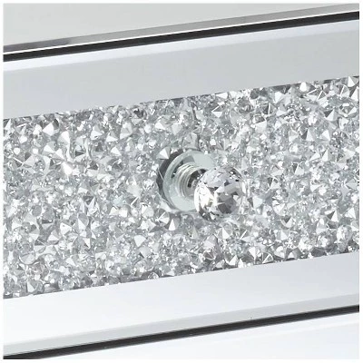This contemporary side table offers glamorous style and convenient storage space. It comes in a mirrored finish for a sophisticated modern look and has three drawers built into the design. The drawers fronts are decorated with crushed glass crystal accents and have faceted glass knobs, resulting in a shimmering, sparkling appearance.