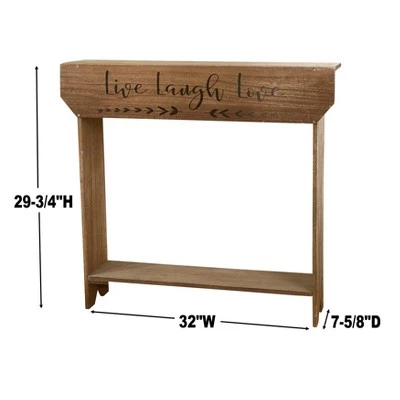 The slim design of this console table with a farmhouse motif and Live Laugh Love makes it perfect for small spaces. It has an authentic country look, complete with a lovely phrase inscribed in the solid wood finish. No matter what room you place it in, it will add a vintage touch. Use it in the living room for an extra surface or in the foyer to place everyday necessities on. Wood. Assembly required; assembly hardware included. 32″W x 7-5/8″D x 29-3/4″H.