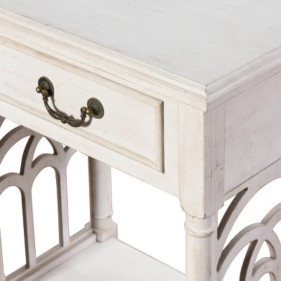 Enjoy a little extra storage and style in your bedroom or living room with this distressed white side table. Featuring a single drawer and bottom shelf with side detailing this piece is perfect to flank a couch or bedside. Constructed from MDF with veneer and fir wood, this side table will bring style to your space for years to come. Regardless if you put it in the bedroom or family room, this side table stands out. This will pair well with farmhouse styling and is sure to be a conversation piece.