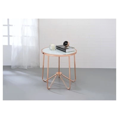 Add utility and style to your contemporary space with an Alivia End Table from Acme. This rose gold end table features a frosted glass surface and slim, graceful legs that will draw attention to the contents of the table top. Pair this small end table with modern decor for a glamorous touch.
