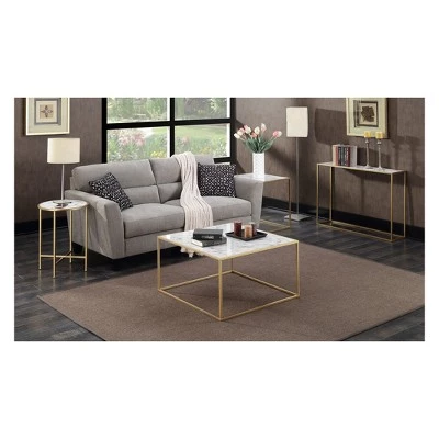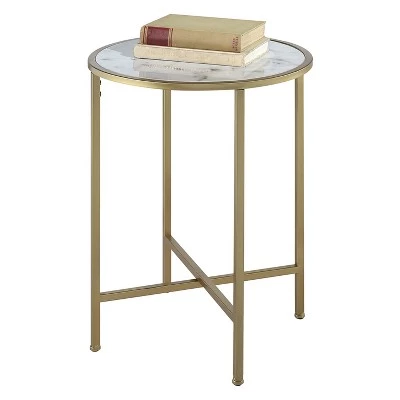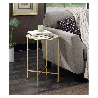 The Gold Coast Faux Marble Round End Table combines Victorian and modern concepts. The smooth faux marble table top paired with clean lines create a crisp look. The open breezy feel of this table completes the look. This table also features quick and easy assembly. Available in multiple finishes this piece will easily complement the look of any new or existing decor. Look for other items from the Gold Collection sold separately.