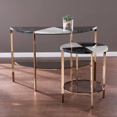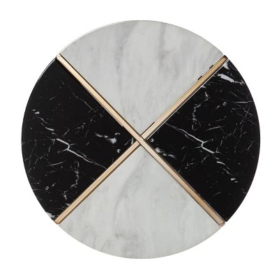Add a unique element to your living space with the Aiden Lane Lenaedo Round Faux Marble End Table. A smoked glass shelf displays dΓ©cor pieces or framed photos, while the black and white faux marble top holds your cup of coffee. Perfect for your small space, this round accent table slides neatly alongside your sofa or into your entryway. Your living area goes contemporary chic when you bring home this two-tier end table.