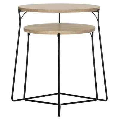 - Round wooden top stackable tables with minimalist iron leg design
