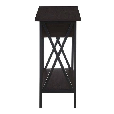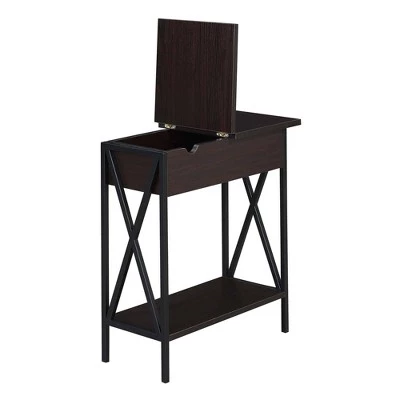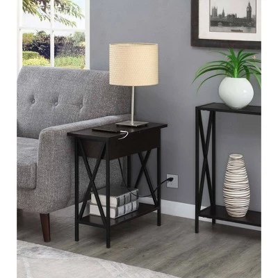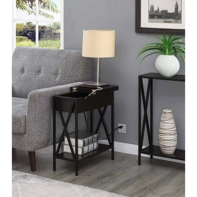 Add functionality to your home with the Tucson Flip Top End Table with Charging Station and Shelf by Breighton Home. The flip-top reveals a convenient charging station as well as storage space for your remote controls or favorite book. The charging station includes two standard outlets and two USB ports that can easily charge your phone, tablet, and even laptop. Also included is the cable management hole which allows you to store multiple devices on the tabletop without the tangling or damaging of cords. This units power supply cord is 6 feet in length giving you the flexibility to display your table where you choose. Additionally, a bottom shelf is also included for storage or display. Modernize your home with coordinating pieces from the Tucson Collection by Breighton Home, each sold separately.