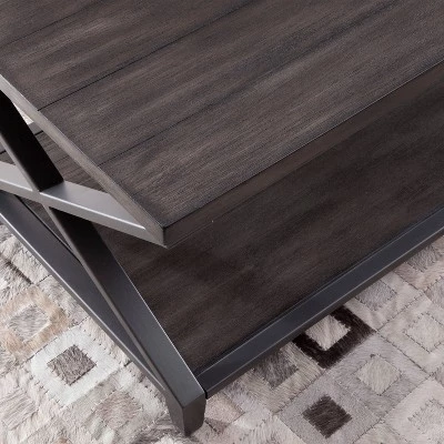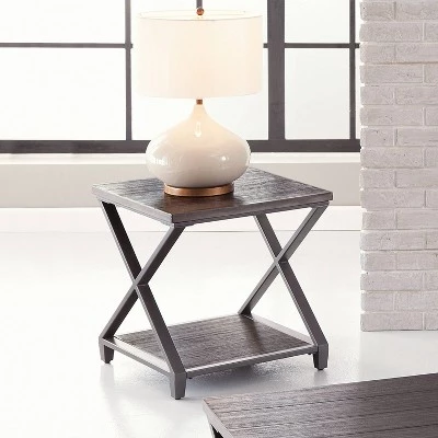 Step up your look with the sophisticated, rustic Alex End Table. The table is scaled perfectly for your living area and complements many different upholstery styles. The wire-brushed, plank-effect top and bottom shelves with double “x” Β metal side supports frame this striking piece. Your purchase includes one end table. Cocktail table also available for purchase separately.