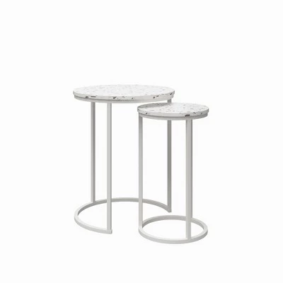 The CosmoLiving by Cosmopolitan Amelia Nesting Tables are a hosting queenβs dream come true. With their space-saving design, the smaller of the pair perfectly fits under the chic end table to allow room for ~activities~. Pull them apart when your squad drops by for added surface for beverages and snacks. The Amelia set is made with a sleek metal frame that pairs with the faux white marble or faux terrazzo tabletop that is every fashionistaβs dream. Adult assembly required; Assembled End Table dimensions: 22.8βH x 18.03βW x 18.03βD. Assembled small table dimensions: 19.88βH x 11.7βW x 11.7βD. Weight limit: 50 lbs.