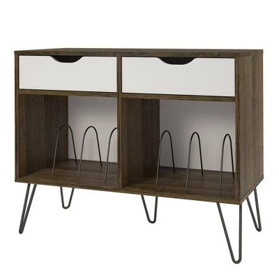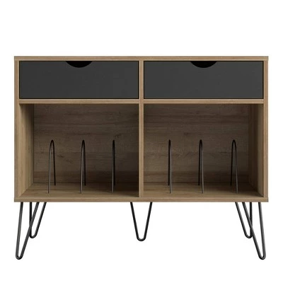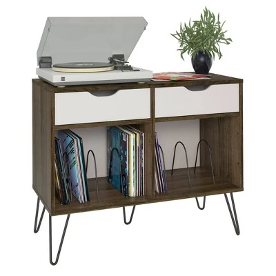 Add a blast from the past with the Novogratz Concord Turntable Stand with Drawers. Inspired from mid-century design, the laminated particleboard and MDF complement the metal hairpin legs for a fun retro look. The double wide Stand offers plenty of space for a record player, speakers and stereo and features 2 large open cubbies with metal dividers to keep your albums upright and organized. Keep your remotes, cassette tapes, and record mats or weights stored away in the 2 spacious drawers. The Novogratz Concord Turntable Stand with Drawers ships flat to your door and 2 adults are recommended for assembly. The Stand can hold up to 60 lbs. while the cubbies will hold 20 lbs. each. Each drawer can hold up to 15 lbs. Assembled dimensions: 31.8βH x 39.7βW x 18βD.
