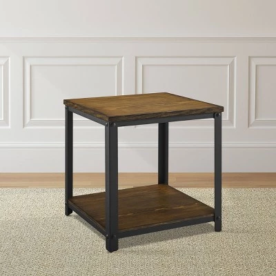Add function and industrial style to your living room with the Logan End table. Mixed-media construction blends with rustic design in the brushed mocha finish on the top and lower shelf and rustic iron frame with exposed rivets. The large bottom shelf is perfect for storage or display of your favorite items. Your purchase includes one end table.